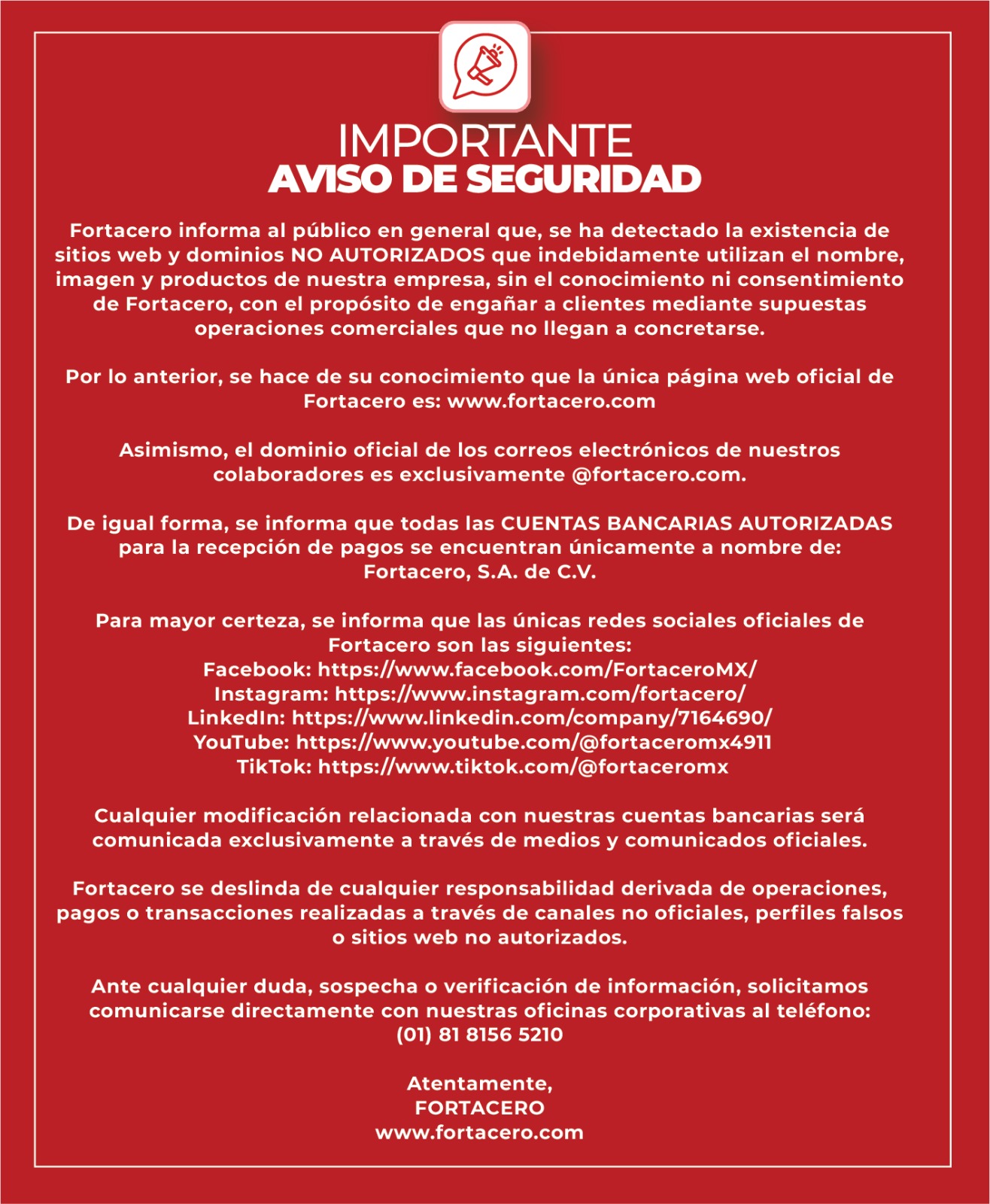 Fortacero se deslinda de cualquier operación realizada a través de los canales no oficiales e invitamos al publico en general que, ante cualquier sospecha, se comunique directamente a nuestras oficinas corporativas a través del teléfono (01)81 81565210